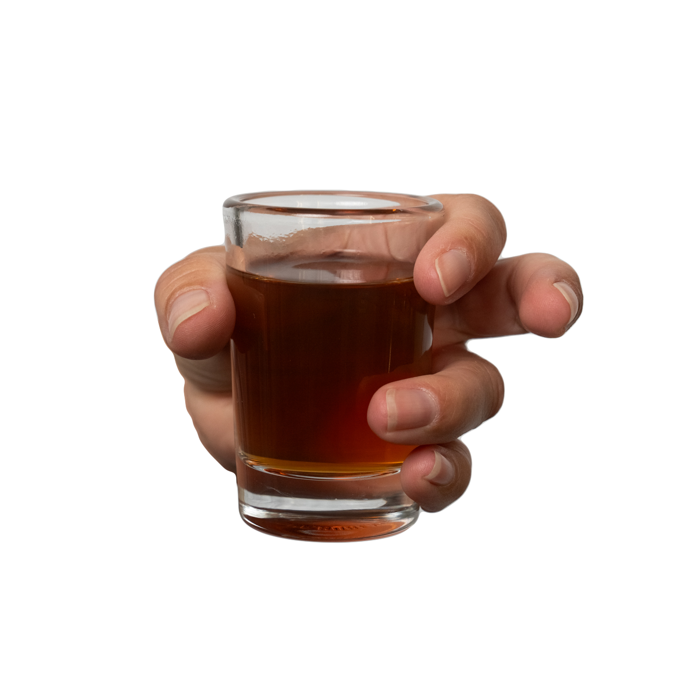 Step 3: Place the contoured schnapps glass in the gap between your middle finger and ring finger and have the glass sitting just slightly above the beer glass. The ring finger is between the two glasses and rests on the rim of the schnapps glass.